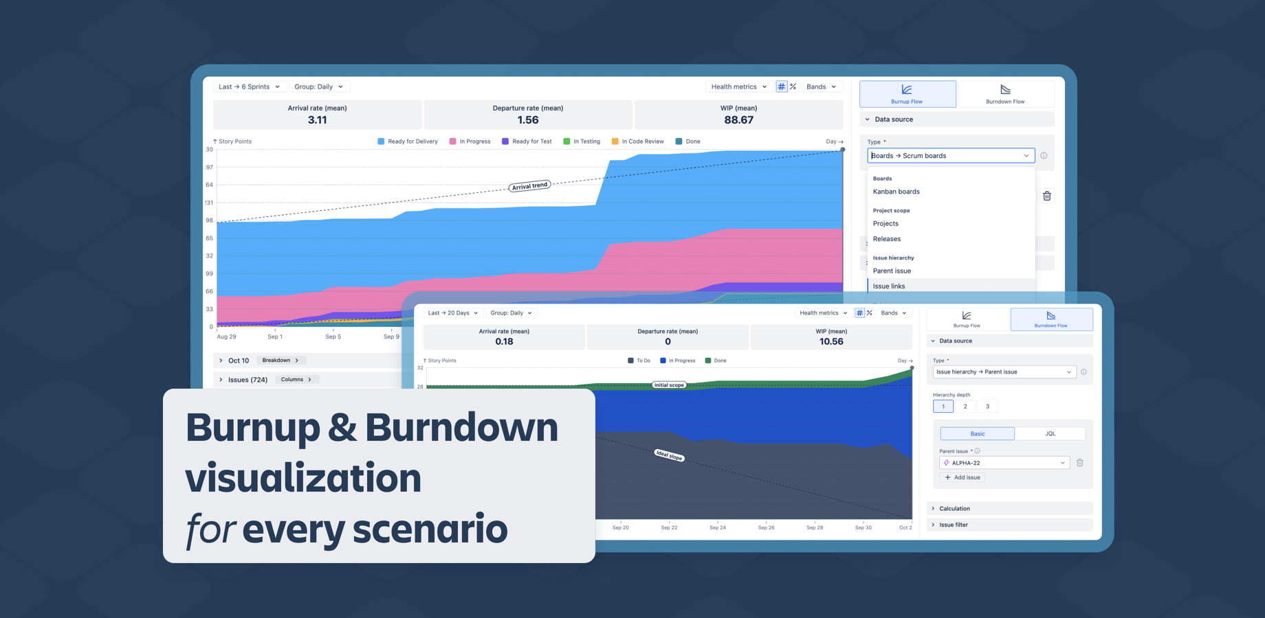 - Switch between Burnup and Burndown visualizations for multiple data sources