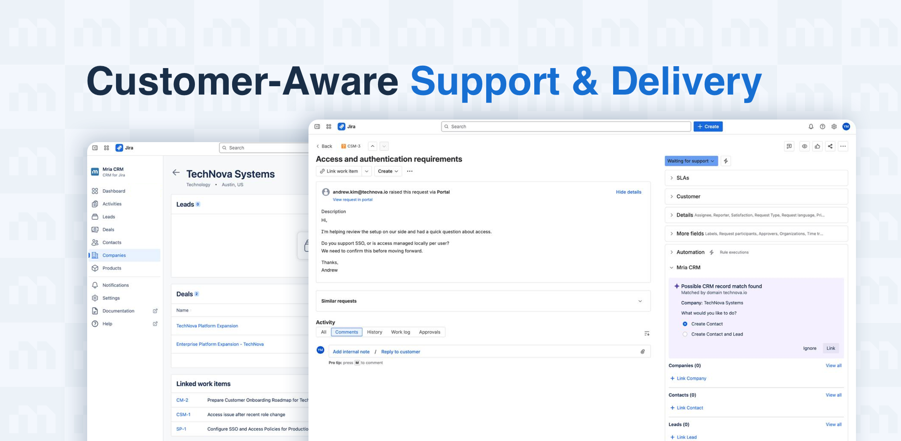 Turn Jira work into customer-aware work. Mria CRM connects issues and JSM requests to customer and revenue context, so teams instantly see which work affects key accounts and business outcomes.