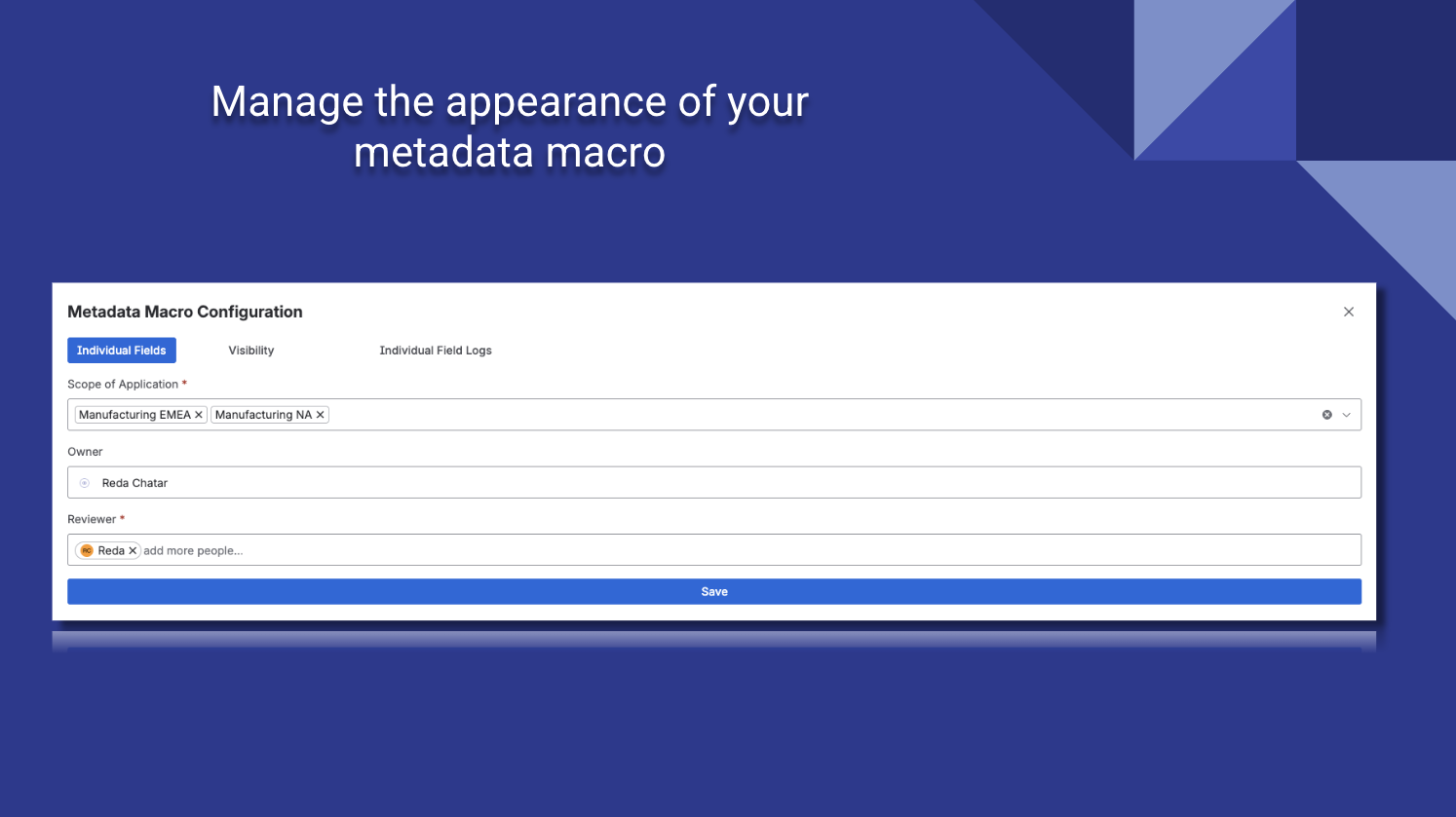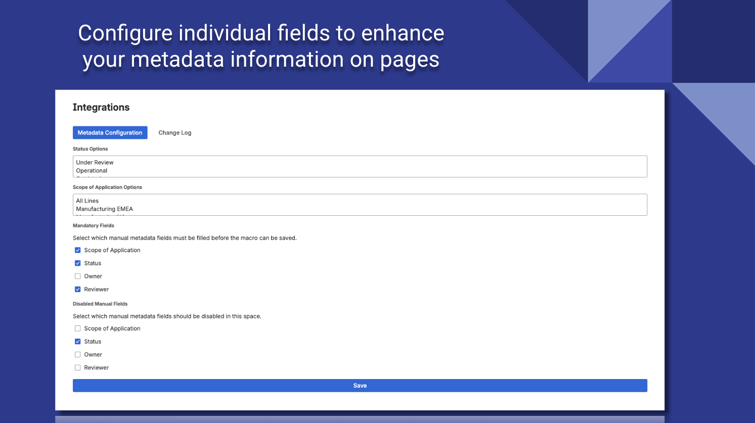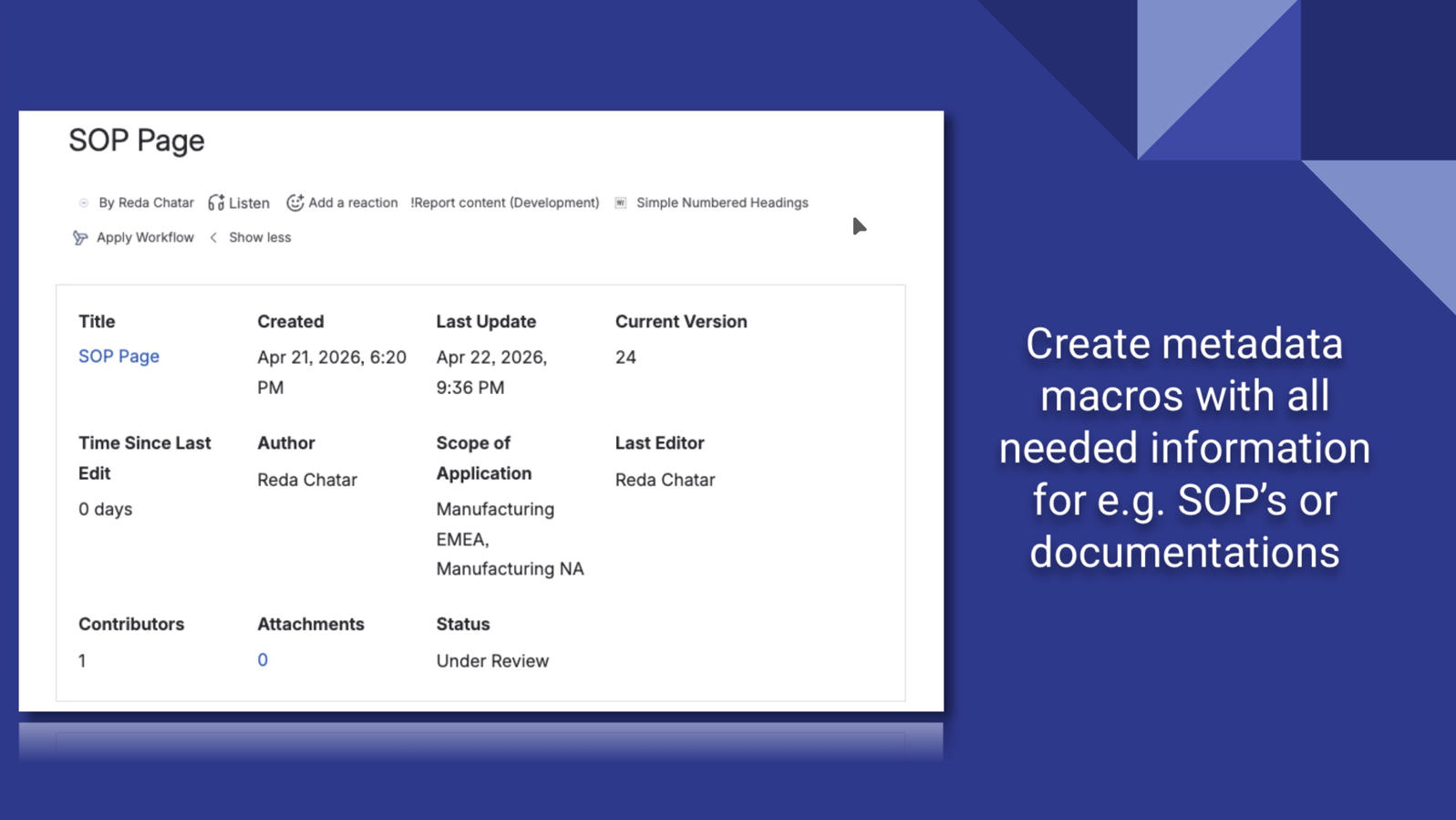Create and manage metadata enhanced pages directly in Confluence with the metadata macro. Use one or multiple macros on a page to position and configure the metadata information around your content. Use the metadata macro to fulfill use cases like SOP control lines, or enhanced traceability informations for documentations and as indicator for information update quality.