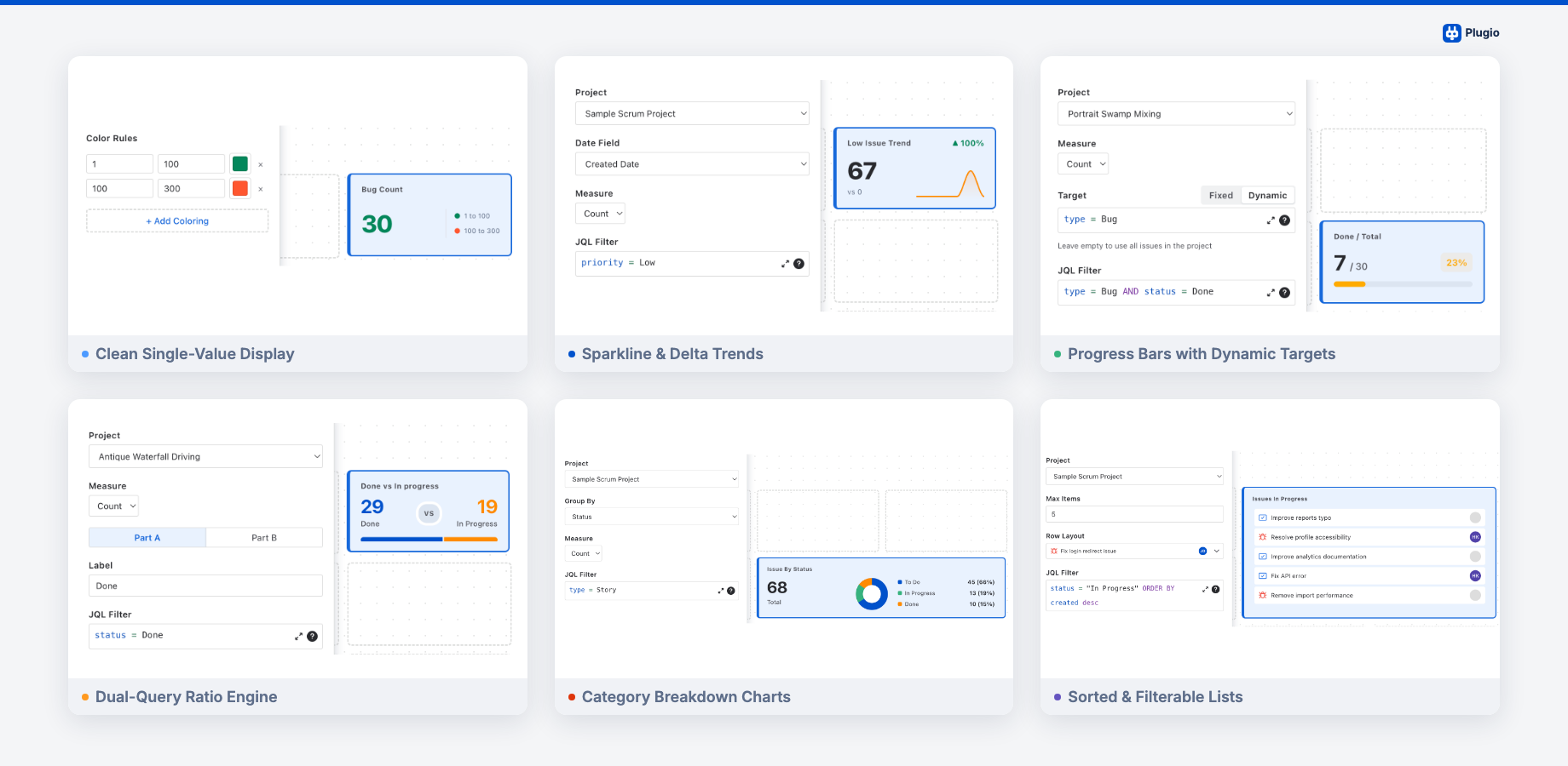 Key highlights of the appTurn any Jira data into a live KPI dashboard — 6 card types, JQL-powered metrics, and a drag-and-drop layout designer