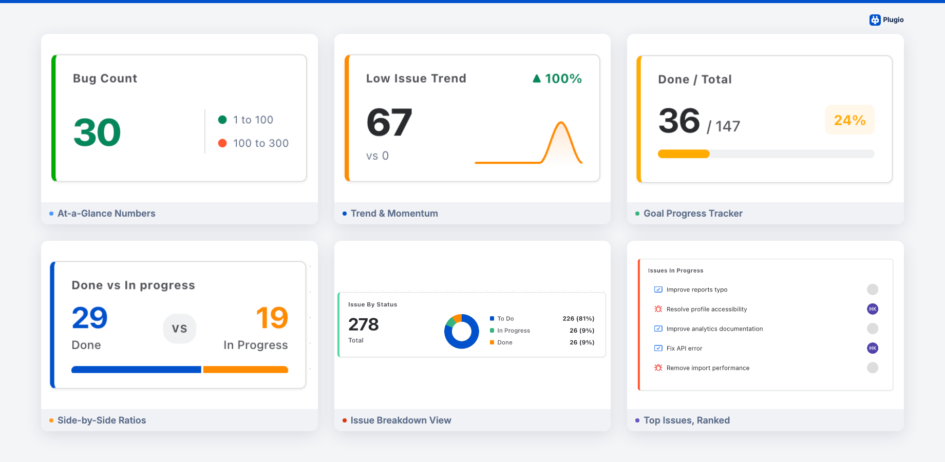 From simple metric counters to trend sparklines, progress bars, ratio comparisons, distribution charts, and ranked issue lists — choose the card type that fits each metric perfectly.