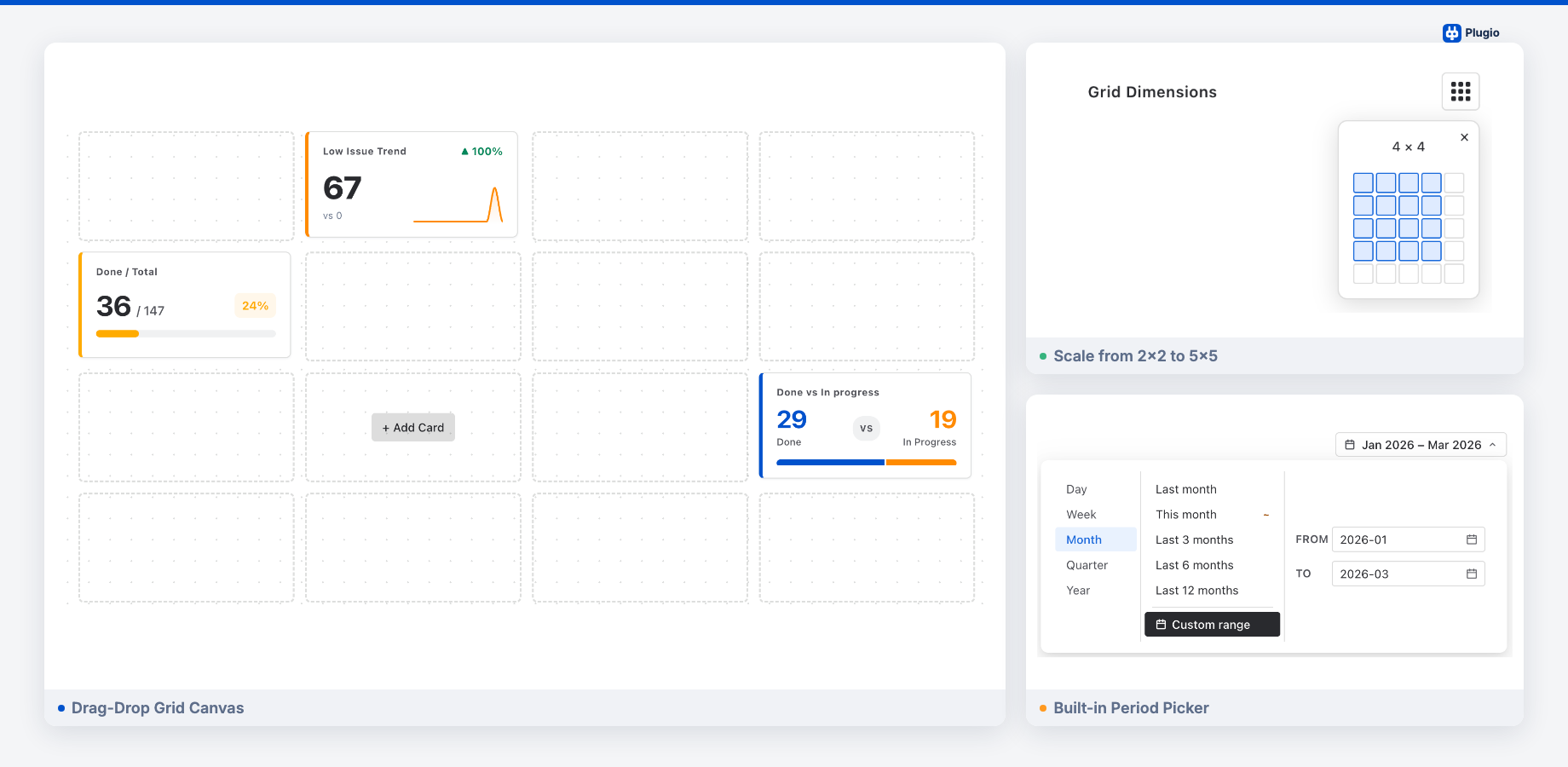 Drag and drop cards onto a flexible grid that scales from 2×2 to 5×5. Switch time periods with one click using the built-in period picker. No coding, no config files.