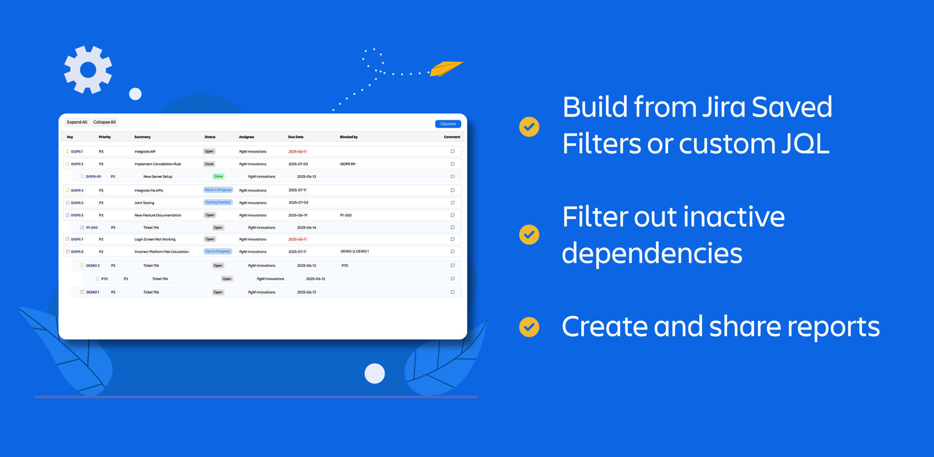🔹Filter out the noise: Build from Jira Saved Filters or custom JQL, with quick filters to hide non-blocked or inactive items.